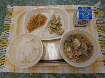 牛乳・ご飯・白菜と豆腐団子のスープ