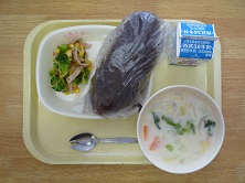 牛乳 ココア揚げパン ブロッコリーとコーンのサラダ