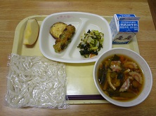 牛乳 なめこおろしうどん 竹輪とサツマイモの天ぷら