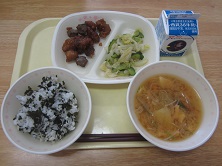 牛乳 わかめご飯 豚肉のかりん揚げ